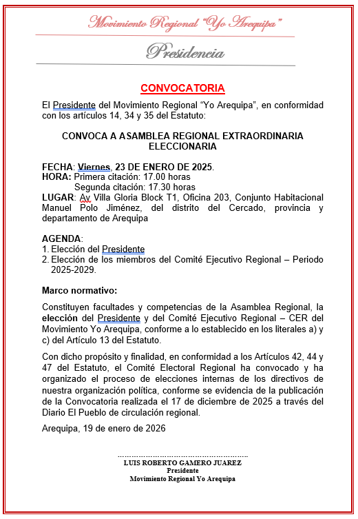 El Movimiento Regional Yo Arequipa es un movimiento político de carácter regional, con proyección nacional, que se constituye para lograr el desarrollo de nuestra región, teniendo como eje central el desarrollo humano y el desarrollo sostenible trabajando concertadamente con los ciudadanos, entes sociales, colegios profesionales, etc. por el desarrollo socioeconómico de la Región Arequipa, sobre la base de los principios de: dignidad de la persona humana, democracia, legalidad, libertad, solidaridad, igualdad, justicia social, responsabilidad, honradez, verdad, belleza, honestidad, participación, servicio a la región, ética pública y ciudadanía y respeto a nuestras Leyes y la Constitución Política.